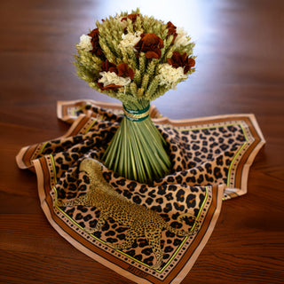 Malfroy, soierie lyonnaise depuis 1939, et Lachaume ont imaginé ce duo pour la Fête des Mères : un foulard au motif léopard iconique, accompagné d’un bouquet de blé et d’hortensias aux teintes assorties. Une alliance d’élégance, de nature et de style.