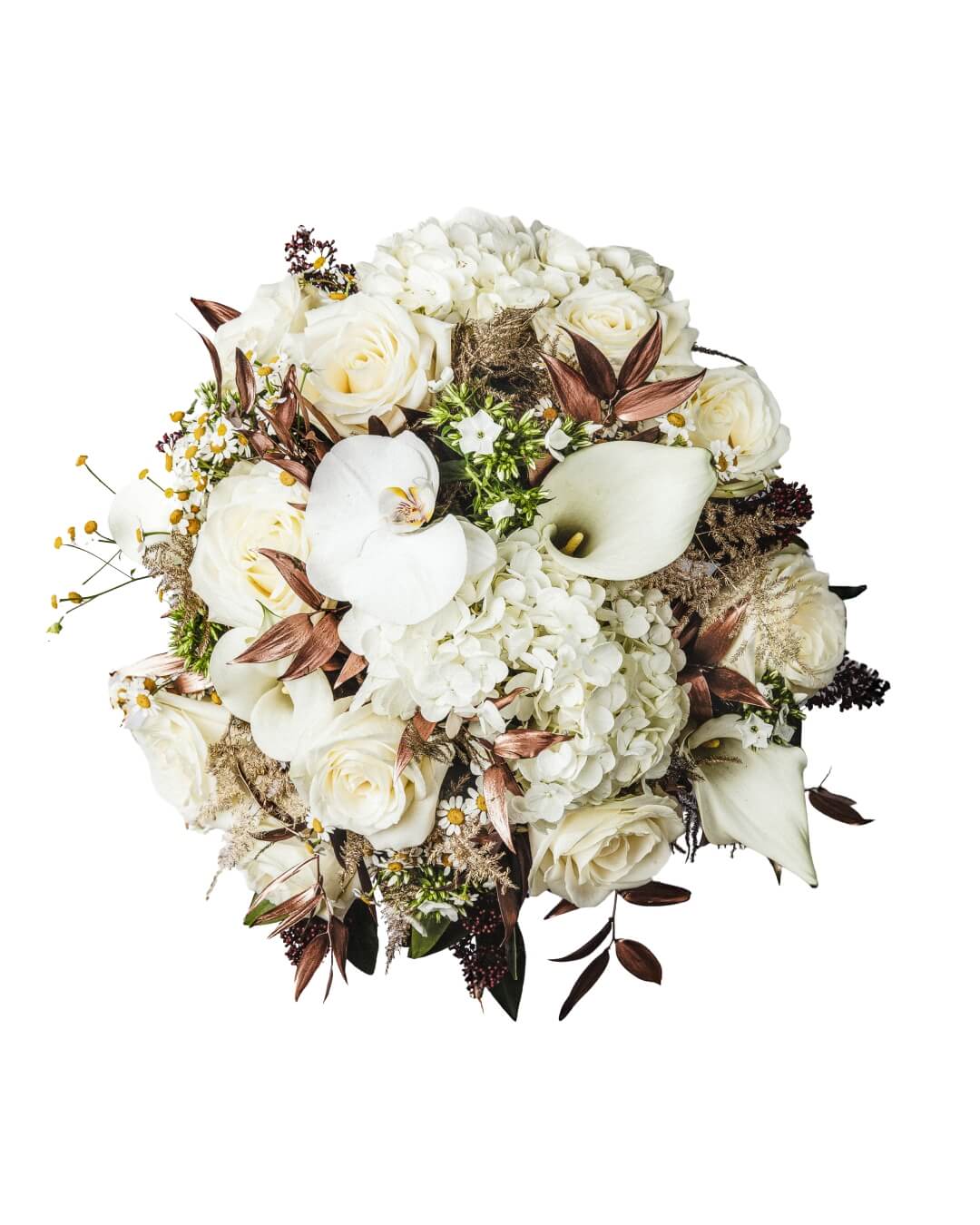 - Taille II : 15 roses, 3 hortensias, 5 camomilles, 5 phlox, 5 callas, 1 fleuron d'orchidée, ruscus or cuivré et asparagus doré. Hauteur d’environ 42 cm. Diamètre d’environ 42 cm.