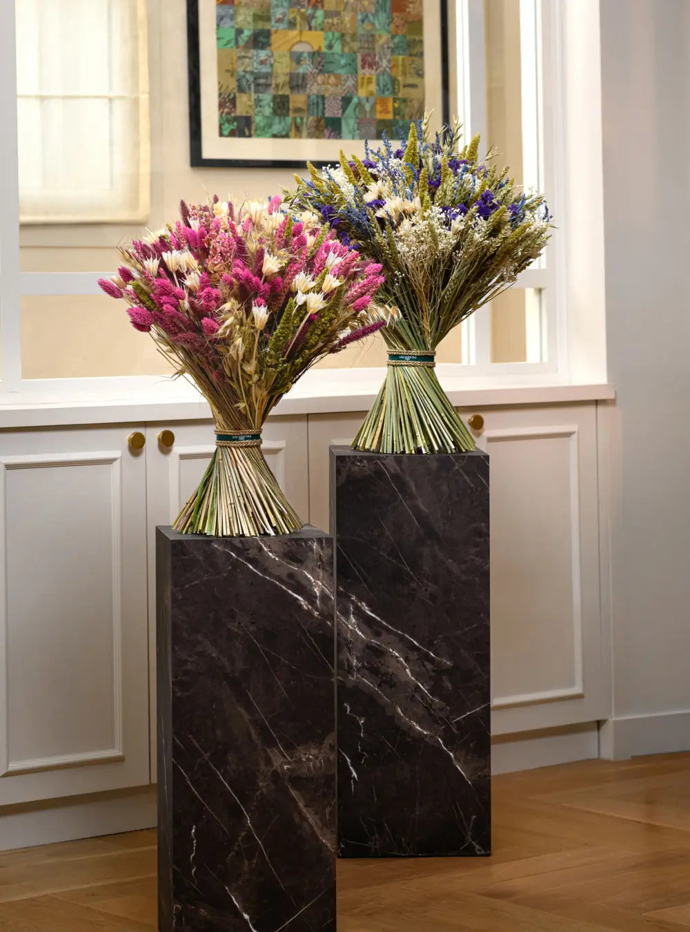 The Caroline Bouquet is a tribute to softness and femininity. Each bouquet is meticulously handcrafted with exceptional attention to detail. The harmonious blend of textures and rosy hues enhances the delicate beauty of dried flowers, where pink setaria, pink wheat and fuchsia phalaris intertwine with pink delphinium, wild oats, green amaranth, nigella and white carthamus. Designed to bring timeless elegance to your interior, making it a refined decorative piece and a poetic, sophisticated gift.