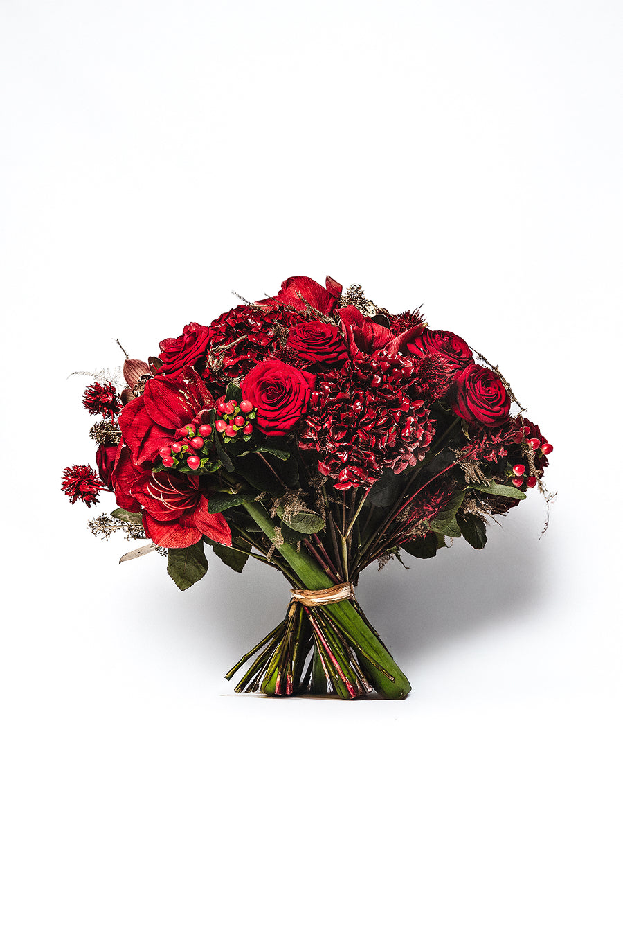 Bouquet classique et élégant, composé de nombreuses variétés de fleurs fraîches rouges, d’hortensias teints à la main rouge cuir, de chardons brillants et d’éclats dorés. Offrez l’intensité et la chaleur des fleurs avec ce bouquet raffiné. Un cadeau idéal pour les fêtes à offrir ou à s’offrir, et qui attirera tous les regards.